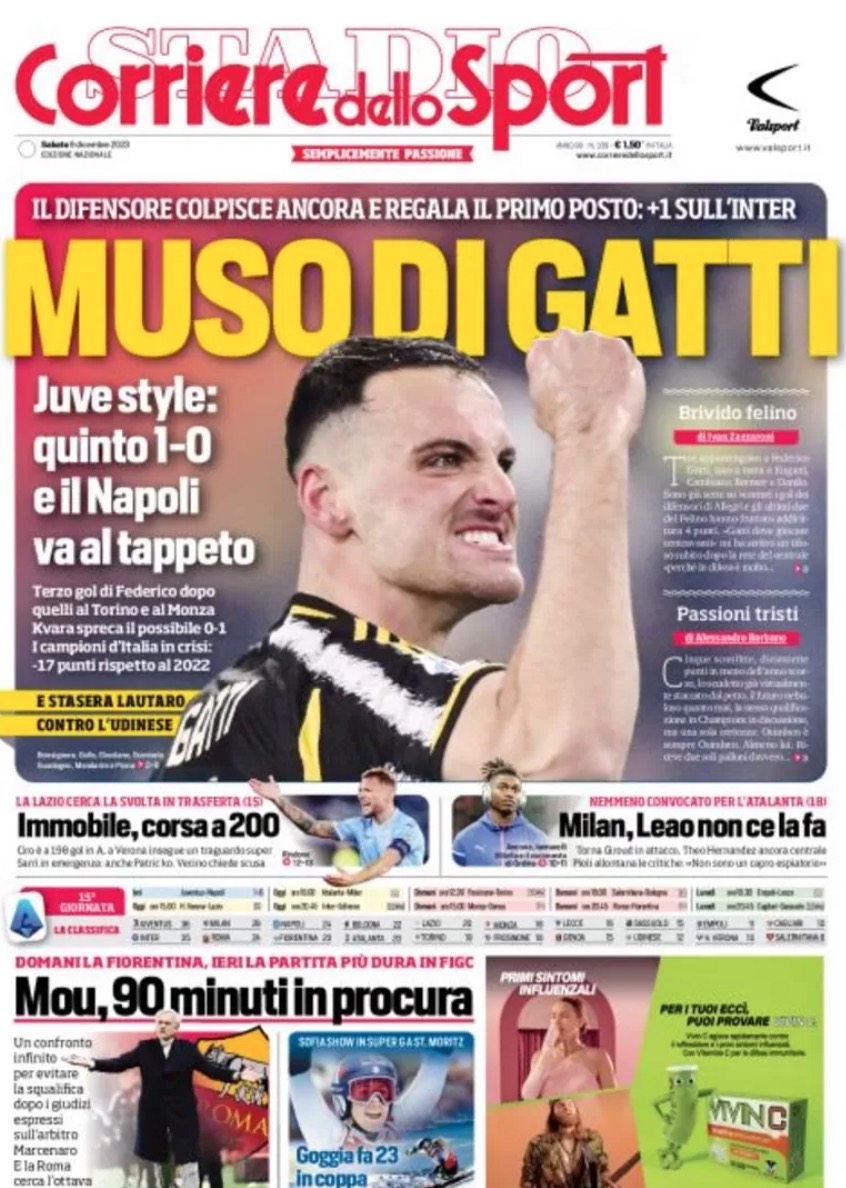 "Muso di Gatti" titola il Corriere dello Sport per raccontare della vittoria della Juventus sul Napoli che vale il primo posto a +1 sull'Inter. "Juve style, quinto 1-0 e Napoli al tappeto". Campioni d'Italia che scivolano a -17 punti rispetto all'anno scorso. Di seguito la prima pagina completa