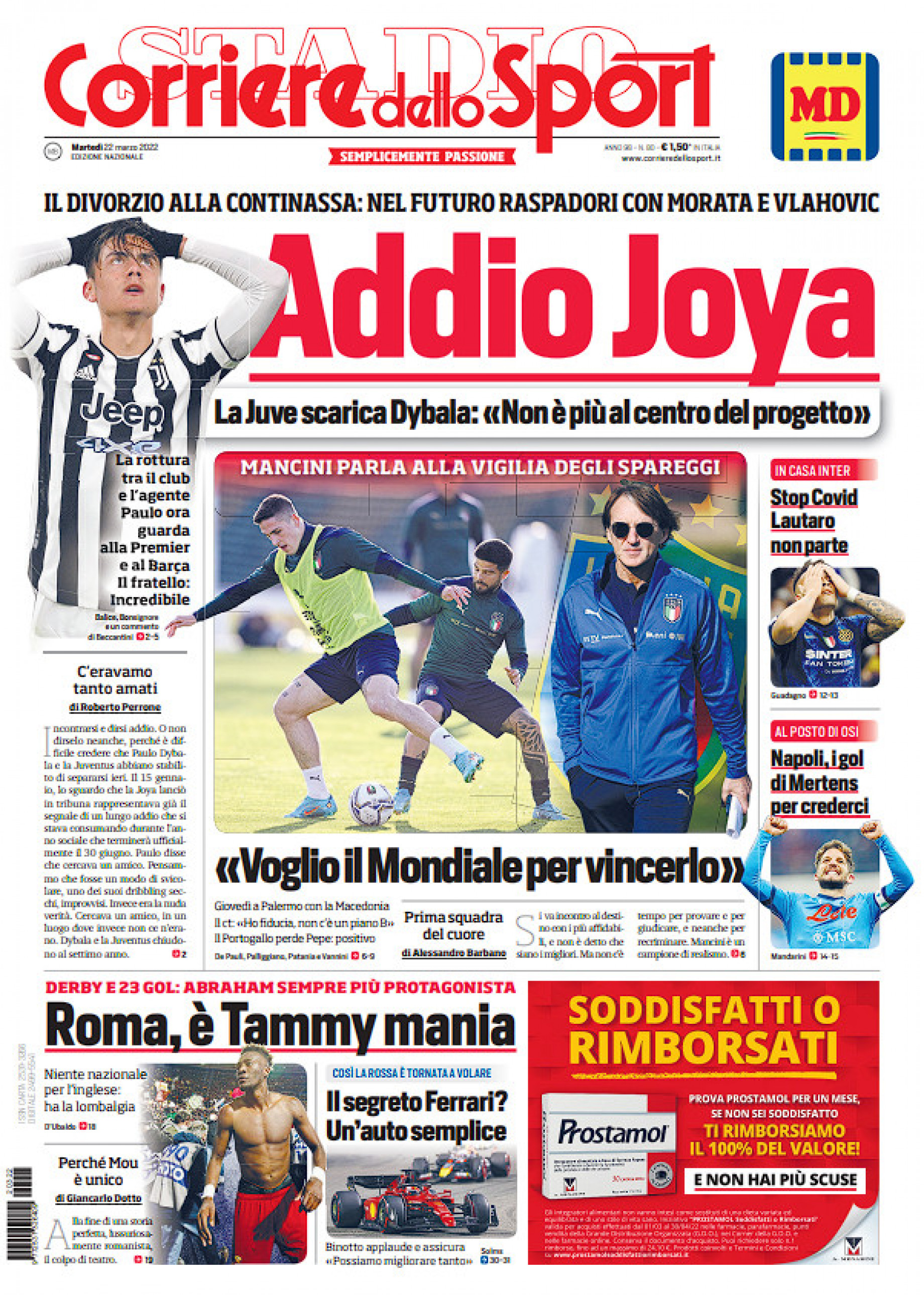 Il Corriere dello Sport apre in prima pagina con la corsa scudetto del Napoli: "Al posto di Osi. Napoli, i gol di Mertens per crederci”. Al centro il mancato rinnovo di Paulo Dybala con la Juventus: "Addio Joya". Ampio spazio anche alle parole forti di Roberto Mancini: "Voglio il Mondiale per vincerlo". In basso la Roma e il grande momento di Abraham: "Tammy mania". Di spalla la positività al Covid di Lautaro Martinez: "Stop Covid: Lautaro non parte".