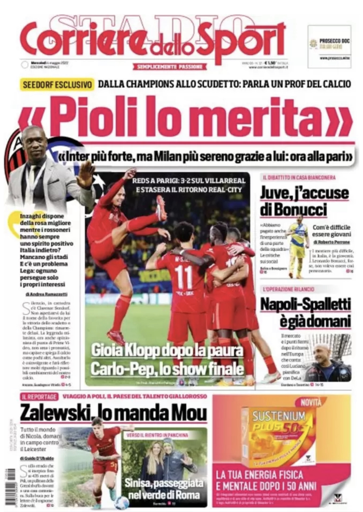 Il Corriere dello Sport apre in prima pagina con le strategie del Napoli per il futuro: "Napoli-Spalletti: è già domani. Il tecnico e i punti fermi dopo il ritorno nell'Europa che conta: così Luciano pianifica con DeLa". In taglio alto le parole di Clarence Seedorf: "Pioli lo merita". Al centro la vittoria del Liverpool che vola in finale di Champions League, di spalla la Juventus.