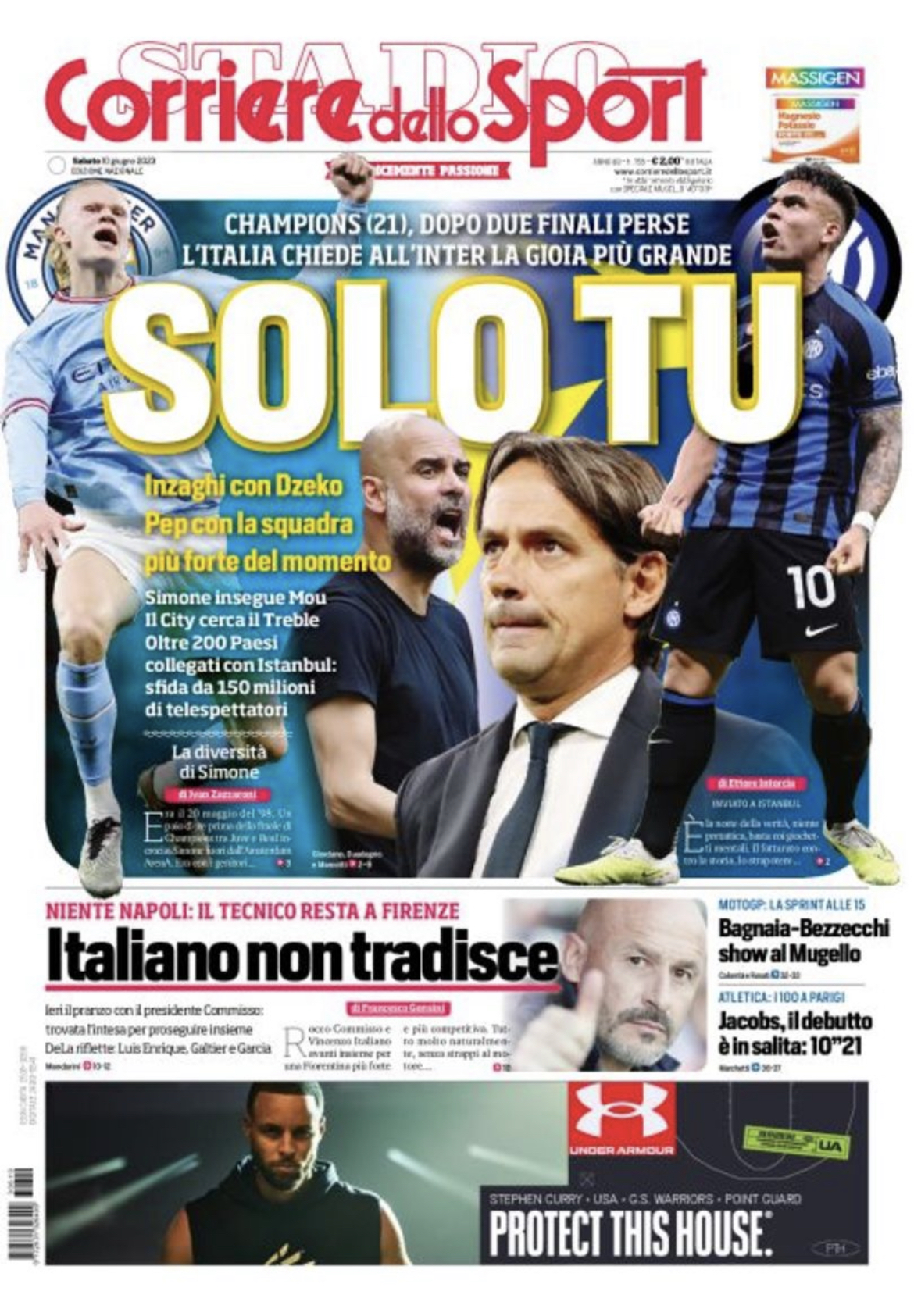 “Niente Napoli, Italiano non tradisce”. Titola così in taglio basso l’edizione odierna del Corriere dello Sport. “Ieri il pranzo con il presidente Commisso: trovata l’intesa per proseguire insieme. DeLa riflette: Luis Enrique, Galtier e Garcia”. Al centro ampio spazio alla finale di Champions League tra Manchester City e Inter: “Solo tu”.