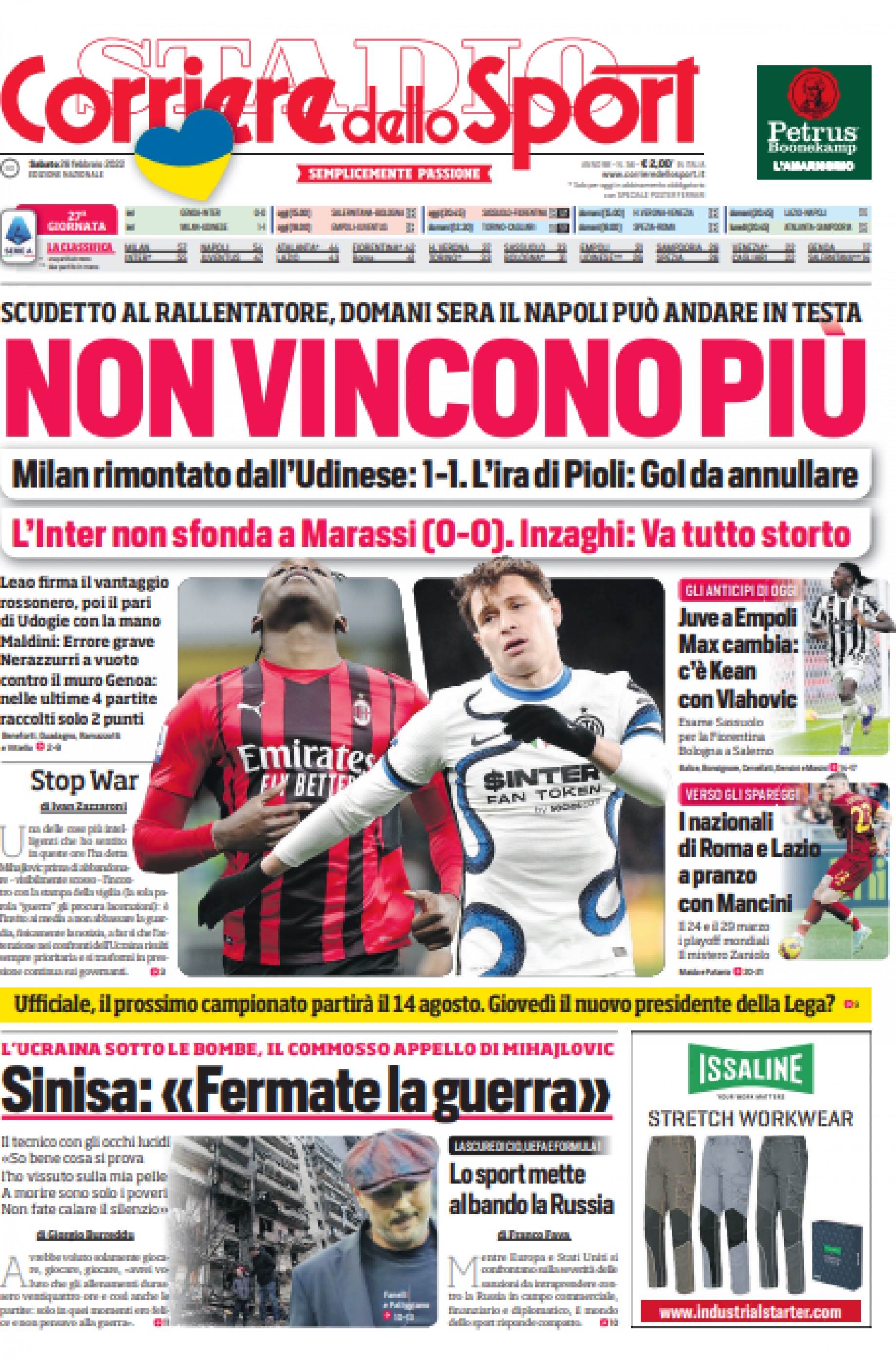 Nell'edizione di oggi il Corriere dello Sport apre in prima pagina col doppio pareggio delle milanesi: "Non vincono più. Scudetto al rallentatore: domani sera il Napoli può andare in testa. Milan rimontato dall'Udinese: 1-1. L'ira di Pioli: gol da annullare. L'Inter non sfonda a Marassi (0-0). Inzaghi: Va tutto storto". Di spalla spazio alla Juventus in campo oggi a Empoli: "Max cambia: c'é Kean con Vlahovic". In taglio basso l'appello di Sinisa Mihajlovic: "Fermate la guerra".
