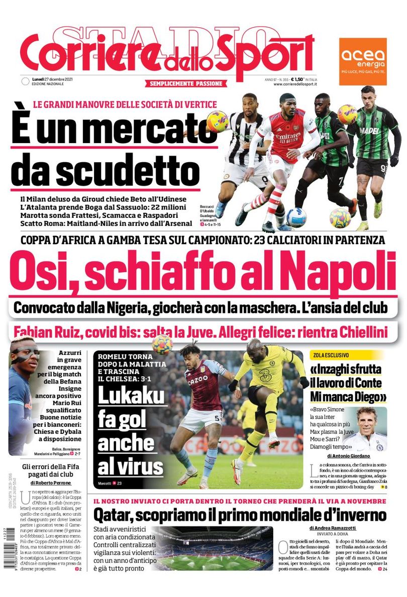 Nell'edizione di oggi il Corriere dello Sport apre con la convocazione per la Coppa d'Africa di Victor Osimhen: "Osi, schiaffo al Napoli. Convocato per la Nigeria, giocherà con la maschera. L'ansia del club". A centro pagina spazio a Fabian Ruiz, contagiato in Spagna: "Fabian Ruiz, covid bis: salta la Juve". In taglio alto spazio alle mosse di mercato delle squadre di vertice: "E' un mercato da scudetto". A centro pagina spazio al ritorno dopo il Covid di Romelu Lukaku, in gol col Chelsea: "Lukaku fa gol anche al virus".