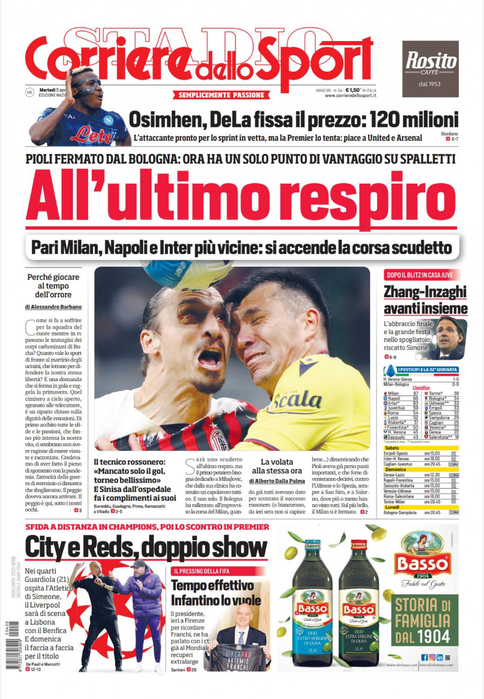 Il Corriere dello Sport apre in prima pagina con la valutazione fatta dal Napoli di Victor Osimhen: “Osimhen, DeLa fissa il prezzo: 120 milioni. L'attaccante pronto per lo sprint in vetta, ma la Premier lo tenta: piace a United e Arsenal". Al centro il pareggio tra Bologna e Milan, che accende ancora di più la lotta scudetto: "All'ultimo respiro". In taglio basso le sfide di Champions League: "City e Reds, doppio show". Di spalla l'Inter: "Zhang-Inzaghi: avanti insieme".
