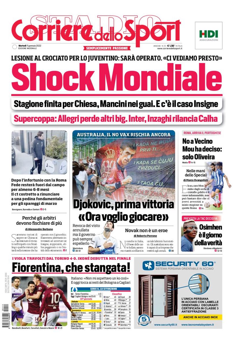 Il Corriere dello Sport apre in prima pagina con il Napoli e con la Tac di controllo prevista oggi a Victor Osimhen: "Prevista la tac decisiva. Osimhen, è il giorno della verità”. Al centro ampio spazio all'infortunio di Chiesa, rottura del legamento crociato e stagione finita: "Shock Mondiale. Stagione finita per Chiesa, Mancini nei guai. E c'è il caso Insigne. Supercoppa: Allegri perde altri tre big. Inter, Inzaghi rilancia Calha". Sulla destra il mercato della Roma, sempre più vicina a Sergio Oliveira, mentre in taglio basso l'incredibile poker subito dalla Fiorentina contro il Torino.