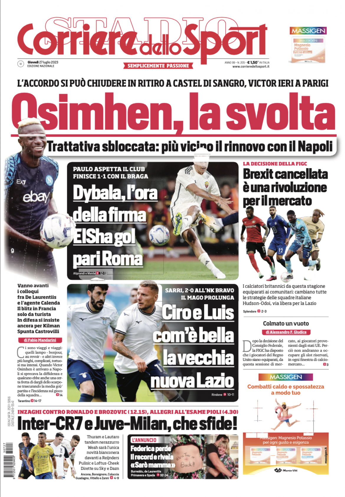 “Osimhen, la svolta”. Titola così in taglio alto l’edizione odierna del Corriere dello Sport: “Trattativa sbloccata: più vicino il rinnovo col Napoli. L’accordo si può chiudere in ritiro a Castel di Sangro, Victor ieri a Parigi. Vanno avanti i colloqui fra De Laurentis e l'agente Calenda. Il blitz in Francia solo da turista. In difesa si insiste ancora per Killman. Spunta Castrovilli”. Al centro la Roma: “Dybala, l'ora della firma. ElSha gol, pari Roma. Paulo aspetta il club: finisce 1-1 con il Braga”. Spazio anche alla Lazio: “Ciro e Luis com'è bella la nuova vecchia Lazio. Sarri, 2-0 all'Nk Bravo. Il Mago prolunga”. Di spalla la decisione della FIGC: “Brexit cancellata è una rivoluzione per il mercato”. In basso: “Inzaghi contro Ronaldo e Brozovic (12.15), Allegri all'esame Pioli (4.30)”.