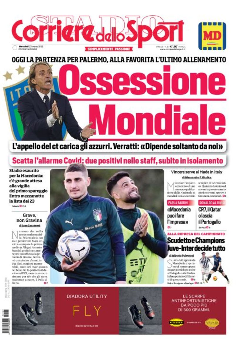 "Ossessione Mondiale", apre così in prima pagina il Corriere dello Sport nell'edizione di oggi. "L'appello del ct carica gli azzurri. Verratti: 'Dipende soltanto da noi'. Scatta l'allarme Covid: due positivi nello staff, subito in isolamento". Di spalla spazio al derby d'Italia in programma alla ripresa del campionato: "Scudetto e Champions: Juve-Inter decide tutto".