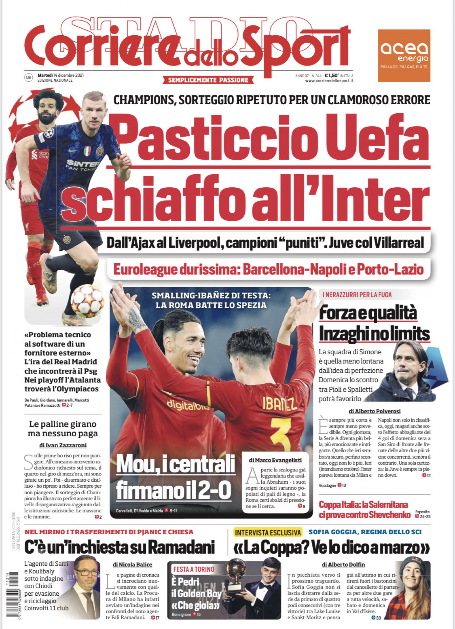Il Corriere dello Sport apre in prima pagina con il pasticcio avvenuto durante il sorteggio di Champions: "Pasticcio Uefa, schiaffo all'Inter. Champions, sorteggio ripetuto per un clamoroso errore. Dall'Ajax al Liverpool, campioni "puniti". Juve col Villarreal. Europa League durissima: Barcellona-Napoli e Lazio-Porto". Di spalla spazio all'Inter: "Forza e qualità, Inzaghi no limits". In taglio centrale spazio alla Roma con: "Mou, i centrali firmano il 2-0".