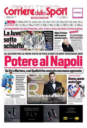 Il Corriere dello Sport apre in prima pagina con il primato in solitaria del Napoli: “Potere al Napoli. Gli azzurri per la prima volta in fuga scudetto dopo trentadue anni. Da Osi a Mertens, così Spalletti ha costruito una nuova egemonia. Il grande ritorno del cannoniere belga rilancia le ambizioni del club. Domani il test chiave con il Sassuolo che ha battuto il Milan a S. Siro". In taglio alto la Juventus e l'inchiesta sulle plusvalenze: "La Juve sotto schiaffo". Al centro il settimo pallone d'Oro vinto da Leo Messi: "Messi, il premio è un teatrino". A destra il mercato dell'Inter.
