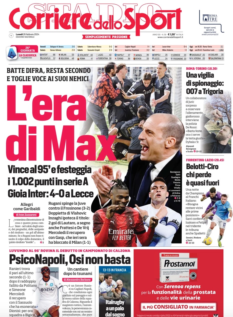 "L'ora di Max", titola il Corriere dello Sport raccontando della vittoria al 95' della Juventus. In taglio basso "PsicoNapoli, Osi non basta" in merito al pareggio raccolto a Cagliari con la beffa all'ultimo secondo. "Un cantiere dopo lo tsunami", il titolo del fondo di commento alla notizia.