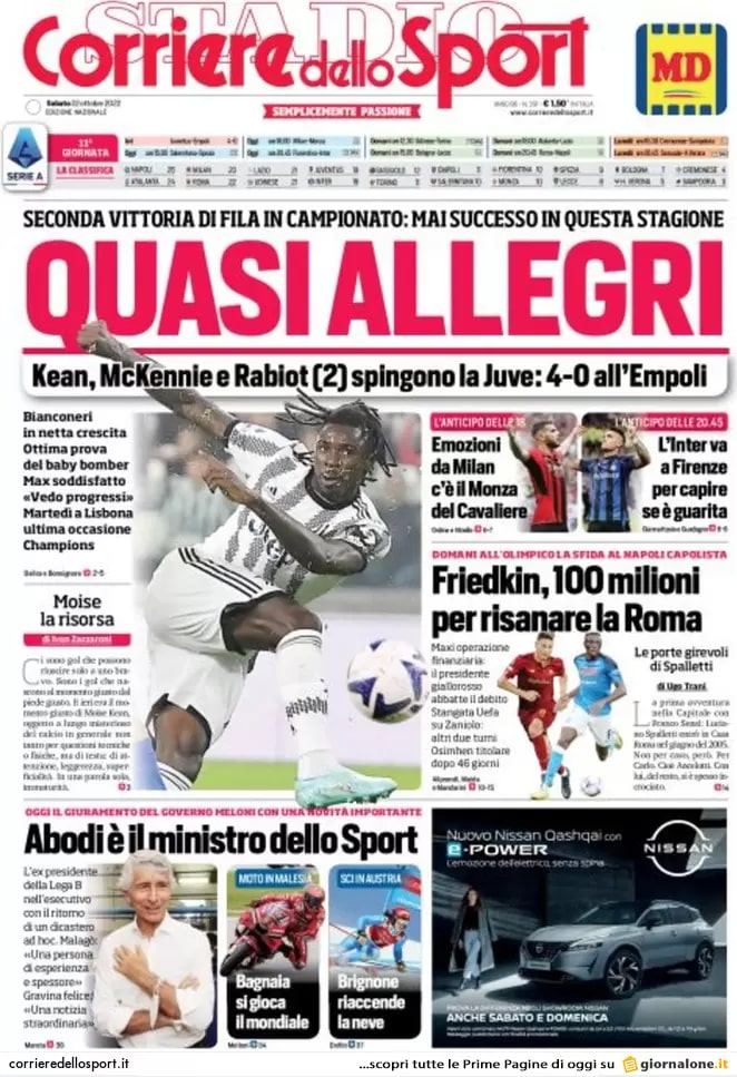 "Quasi Allegri" scrive il Corriere dello Sport in apertura commentando così il 4-0 della Juventus in casa contro l'Empoli. Seconda vittoria di fila per i bianconeri in questa stagione: non era mai successo prima d'ora! Kean, McKennie e una doppietta di Adrien Rabiot spingono la Juve contro i toscani. Bianconeri in netta crescita, ottima prova dell'attaccante classe 2000.