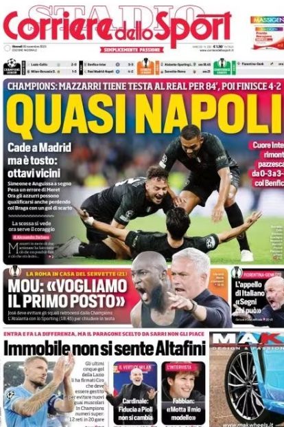 Nell'edizione di oggi, il Corriere dello Sport apre in prima pagina con la sconfitta del Napoli in Champions contro il Real Madrid: "Quasi Napoli. Cade a Madrid, ma è tosto: ottavi vicini". A centro pagina spazio anche per la Roma in campo stasera in Europa League e alle dichiarazioni di Mourinho: "Vogliamo il primo posto". In taglio basso spazio al bomber della Lazio: "Immobile non si sene Altafini".