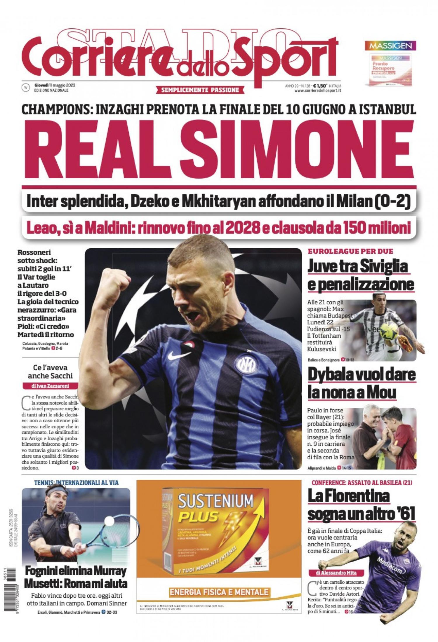 Nell'edizione di oggi il Corriere dello Sport apre in prima pagina con la vittoria dell'Inter sul Milan nell'andata della semifinale di Champions League: "Real Simone. Inter splendida, Dzeko e Mkhitaryan affondano il Milan (0-2)". A centro pagina spazio anche al rinnovo di Rafael Leao in casa rossonera: "Leao, sì a Maldini: rinnovo fino al 2028 e clausola da 150 milioni". Di spalla, spazio alle squadre impegnate in Europa e Conference League: "Juve, tra Siviglia e penalizzazione". "Dybala vuol dare la nona a Mou". "La Fiorentina sogna un altro '61".