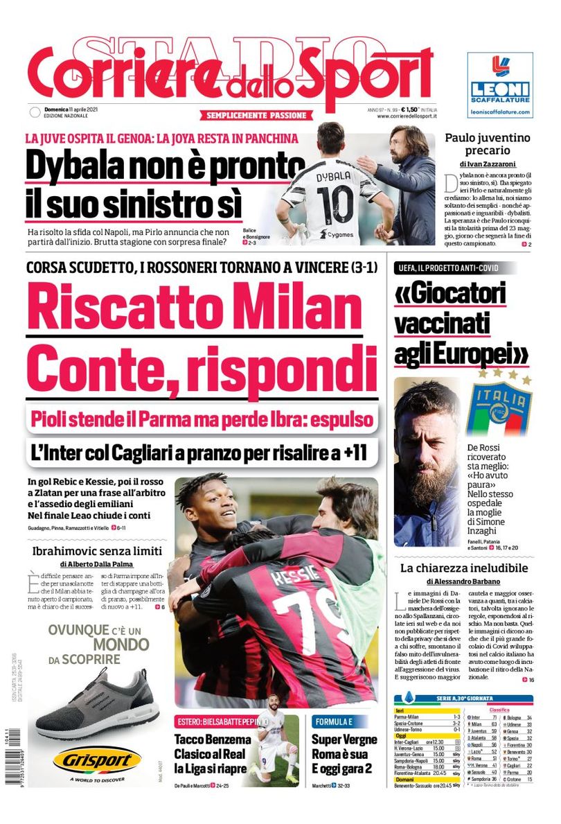 Il Corriere dello Sport apre in prima pagina con la corsa Scudetto e la vittoria del Milan: “Riscatto Milan. Conte rispondi. Pioli stende il Parma ma perde Ibra: espulso. L'Inter col Cagliari a pranzo per risalire a +11". In alto la Juventus: "Dybala non è pronto. Il suo sinistro sì". A lato il progetto Uefa: "Giocatori vaccinati agli Europei".