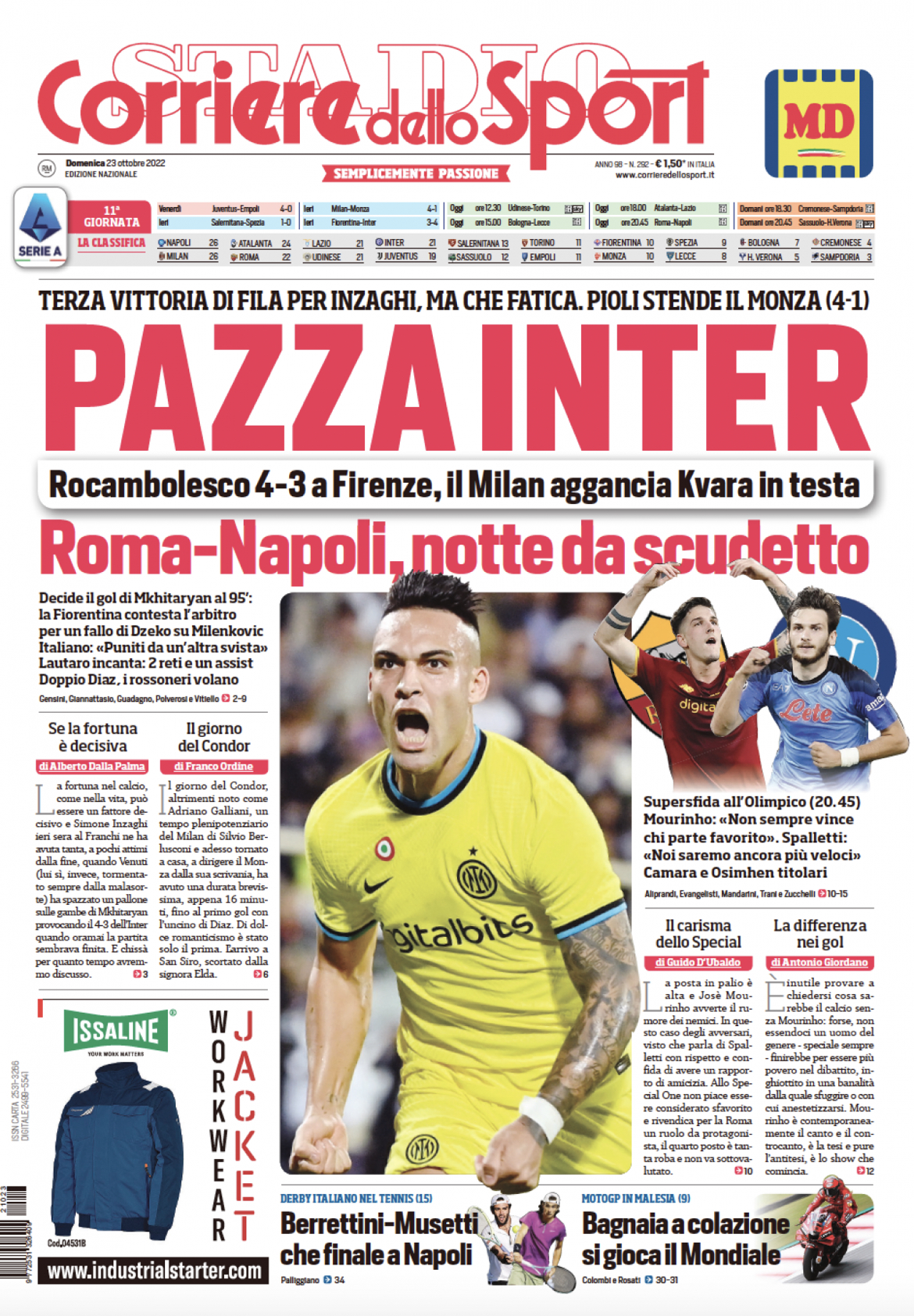 “Roma-Napoli, notte da scudetto”. Titola così di spalla l’edizione odierna del Corriere dello Sport. Ampio spazio al centro anche alla vittoria all'ultimo secondo dell'Inter di Inzaghi per 4-3 al Franchi contro la Fiorentina: "Pazza Inter". In taglio basso il tennis: "Berrettini-Musetti, che finale a Napoli".