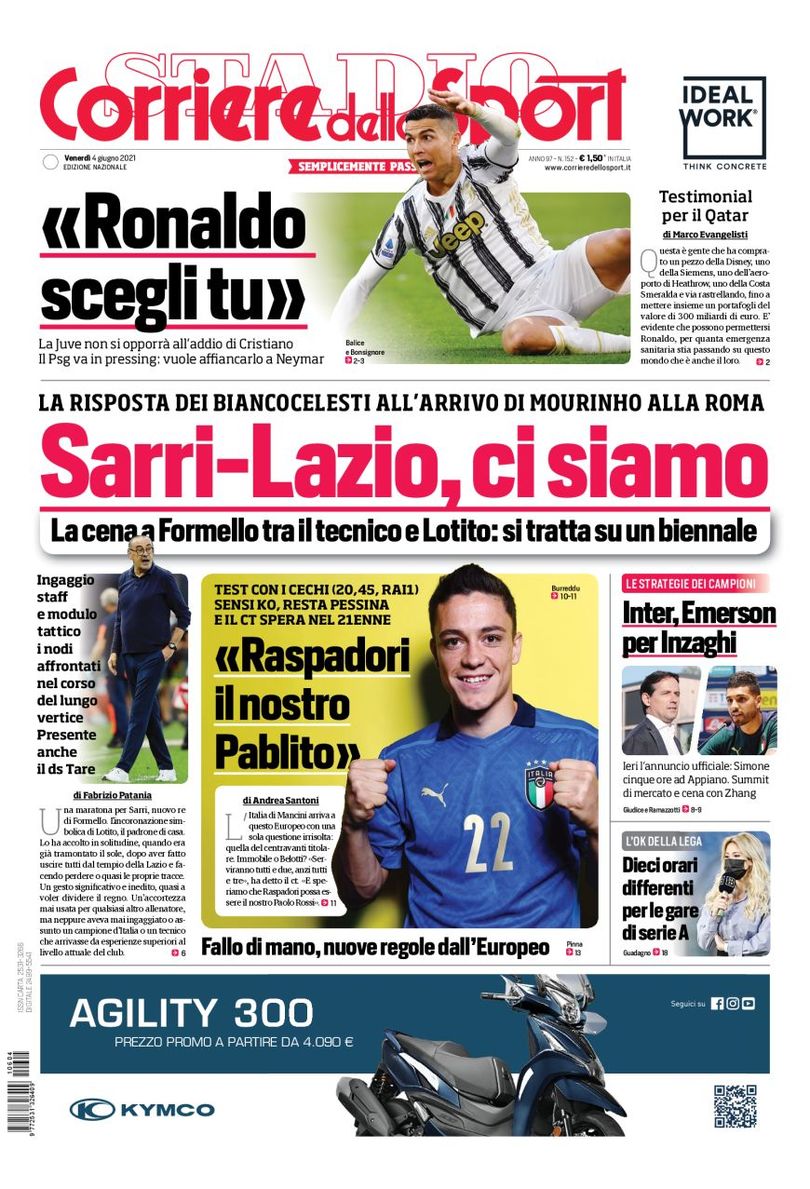 Il Corriere dello Sport apre in prima pagina con l'accordo sempre più vicino tra la Lazio e Sarri: “Sarri-Lazio, ci siamo. La cena a Formello tra il tecnico e Lotito: si tratta su un biennale”. In taglio alto il futuro di Cristiano Ronaldo e sulla destra le manovre di mercato dell'Inter: "Inter, Emerson per Inzaghi". Sulla destra i nuovi orari per le partite della prossima Serie A e al centro si parla di Raspadori.