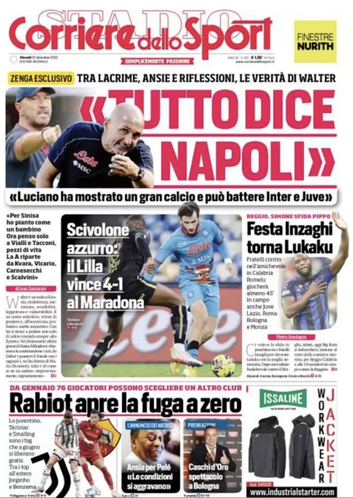 “Scivolone azzurro: il Lilla vince 4-1 al Maradona”. Titola così al centro l’edizione odierna del Corriere dello Sport in riferimento al pesante ko degl Napoli nell'ultima amichevole invernale. In taglio alto l'intervista a Zenga: "Tutto dice Napoli. Luciano ha mostrato un gran calcio e può battere Inter e Juve". Di spalla l'Inter: "Festa Inzaghi: torna Lukaku". In taglio basso spazio al mercato dei giocatori con il contratto in scadenza a giugno 2023: "Rabiot apre la fuga a zero".