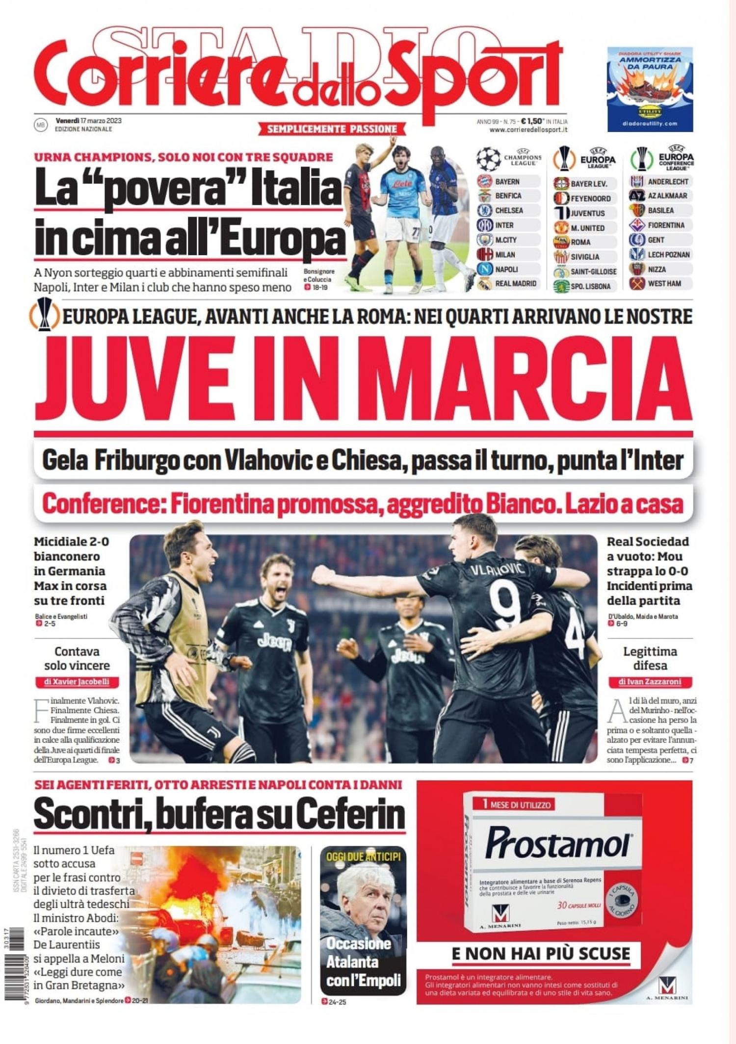 “Scontri, bufera su Ceferin”. Titola così in taglio basso l’edizione odierna del Corriere dello Sport. "Sei agenti feriti, otto arresti e Napoli conta i danni. Il numero 1 Uefa sotto accusa per le frasi contro il divieto di trasferta deli ultrà tedeschi". Al centro ampio spazio a Roma e Juventus, entrambe qualificate ai quarti di finale di Europa League: "Juve in marcia. Avanti anche la Roma: nei quarti arrivano le nostre". Spazio anche alla Conference League: "Fiorentina promossa, aggredito Bianco. Lazio a casa". In taglio alto si continua a parlare delle italiane in Europa: "La "povera" Italia in cima all'Europa".