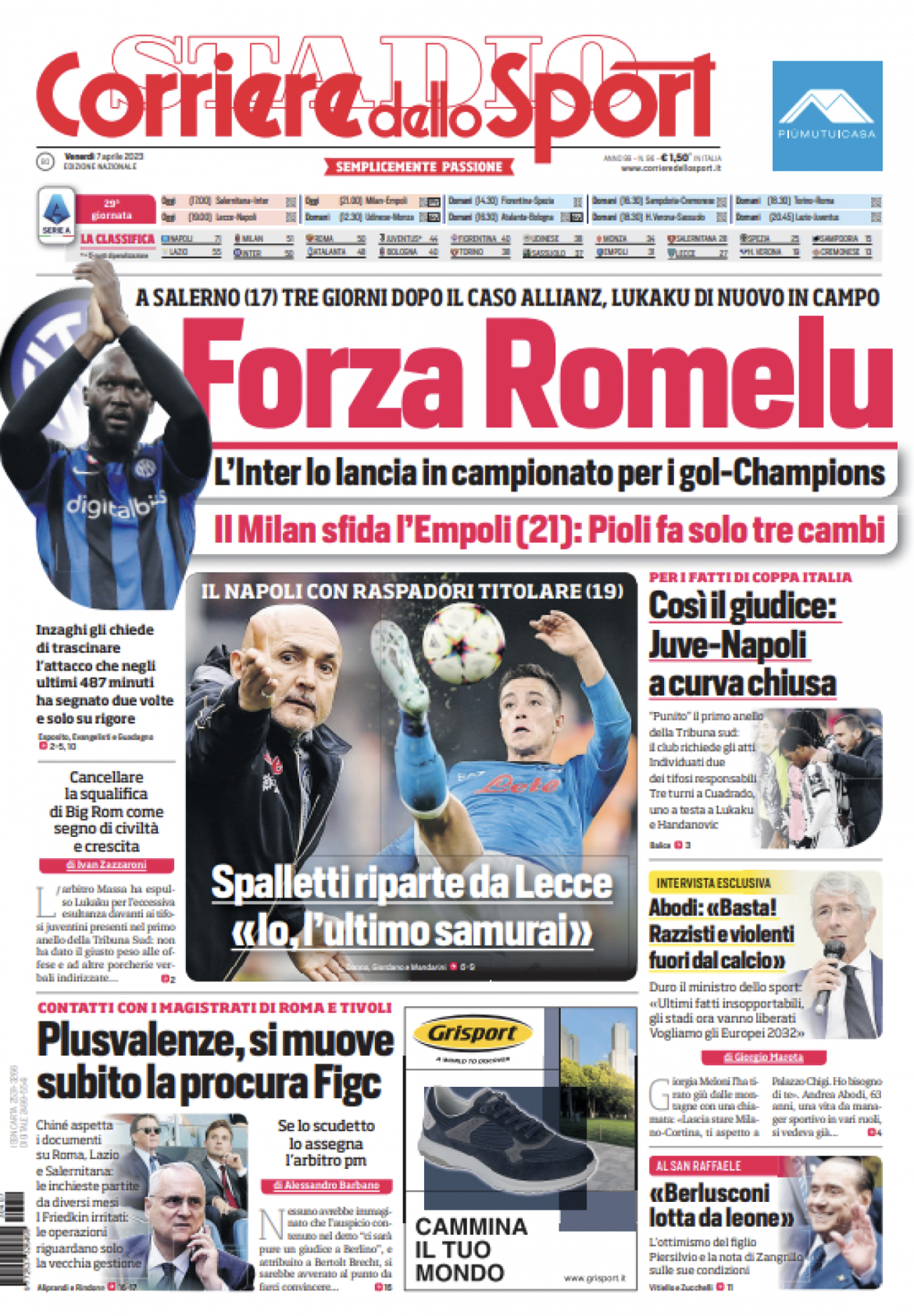 “Spalletti riparte da Lecce: ‘Io, l’ultimo samurai'”. Titola così al centro l’edizione odierna del Corriere dello Sport in riferimento alle parole del tecnico del Napoli. "Il Napoli con Raspadori titolare (19)". In taglio alto il caso Lukaku dopo Juve-Inter e gli impegni di Inter e Milan: "Forza Lukaku. L'Inter lo lancia in campionato per i gol-Champions. Il Milan sfida l'Empoli: Pioli fa solo tre cambi". Di spalle la decisione del Giudice Sportivo di chiudere la Curva della Juventus contro il Napoli dopo gli episodi di razzismo contro l'Inter.
