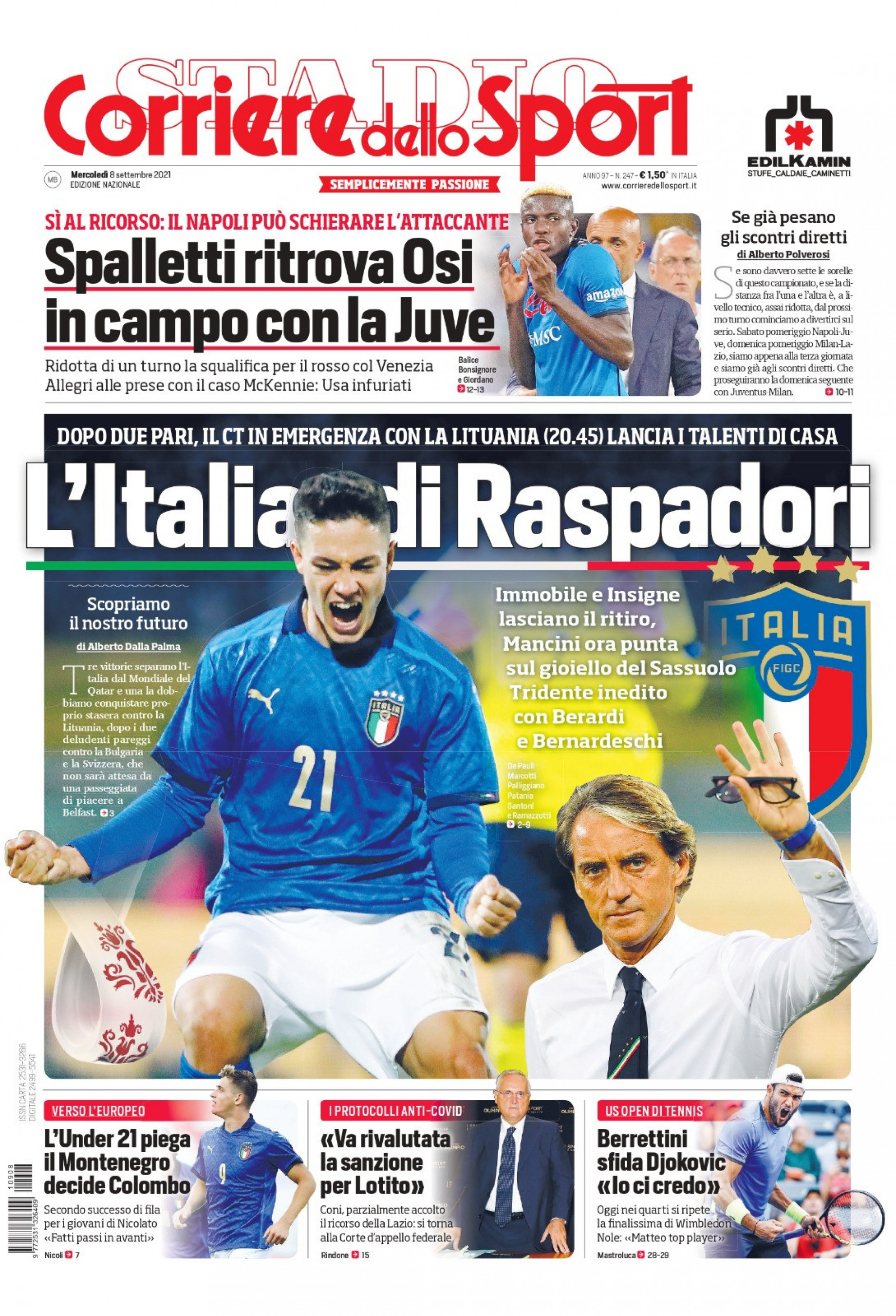 “Spalletti ritrova Osi: in campo con la Juve”. Il Corriere dello Sport dedica l'apertura al'esito del ricorso per Victor Osimhen: "Sì al ricorso: il Napoli può schierare l'attaccante. Ridotta di un turno la squalifica per il rosso col Venezia. Allegri alle prese con il caso McKennie: Usa infuriati". Al centro spazio all'Italia che oggi sfiderà la Lituania: "L'Italia di Raspadori. Dopo due pari, il ct in emergenza con la Lituania (20:45) lancia i talenti di casa".