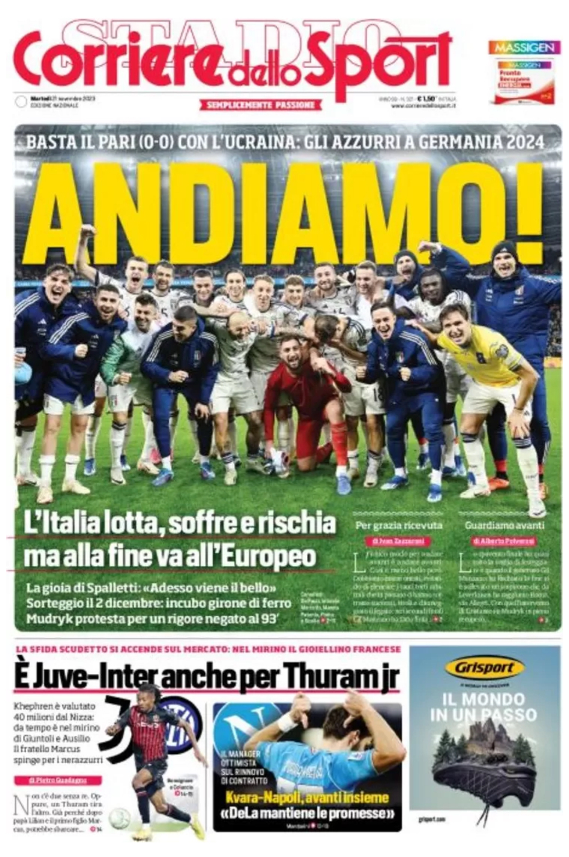 “Andiamo!”. Titola così al centro l’edizione odierna del Corriere dello Sport: "Basta il pari con l'Ucraina: gli azzurri a Germania 2024. L'Italia lotta, soffre e rischia ma alla fine va all'Europeo". In basso il duello di mercato tra Inter e Juve per Thuram jr. Spazio anche al Napoli e alle parole dell'agente di Kvaratskhelia sul rinnovo.
