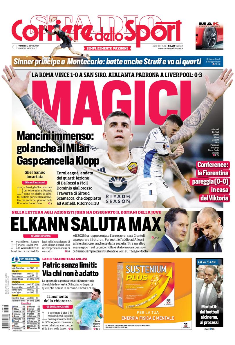 “Magici”. Titola così al centro l’edizione odierna del Corriere dello Sport in riferimento alla vittoria della Roma contro il Milan nell'andata dei quarti di finale di Europa League: "Mancini immenso: gol anche al Milan". Spazio anche al trionfo dell'Atalanta ad Anfield: "Gasp cancella Klopp". Si parla anche dello 0-0 della Fiorentina in Conference League sul campo del Viktoria Plzen. Al centro la Juventus e in taglio basso il match di questa sera tra Lazio e Salernitana.