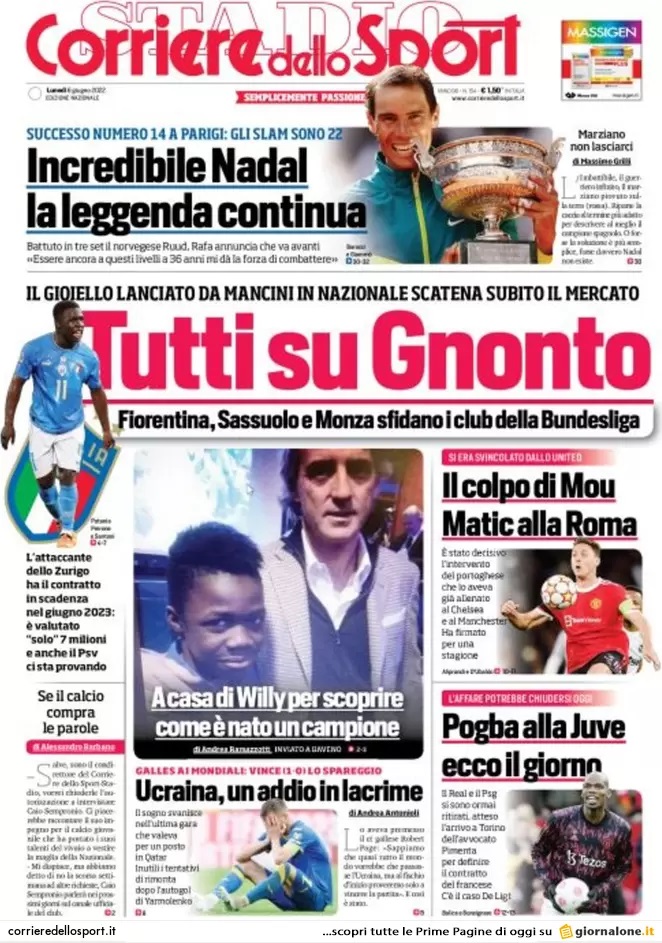 Nell'edizione di oggi il Corriere dello Sport apre in prima pagina con l'asta che si è aperta intorno al debuttante in Nazionale: "Tutti su Gnonto. Fiorentina, Sassuolo e Monza sfidano i club di Bundesliga". Di spalla ancora spazio al mercato con i colpi in arrivo sponda Roma: "Il colpo di Mou: Matic alla Roma", e sponda Juventus: "Pogba alla Juve: ecco il giorno". In taglio basso spazio allo spareggio per i Mondiali in Qatar: "Ucraina, un addio in lacrime".