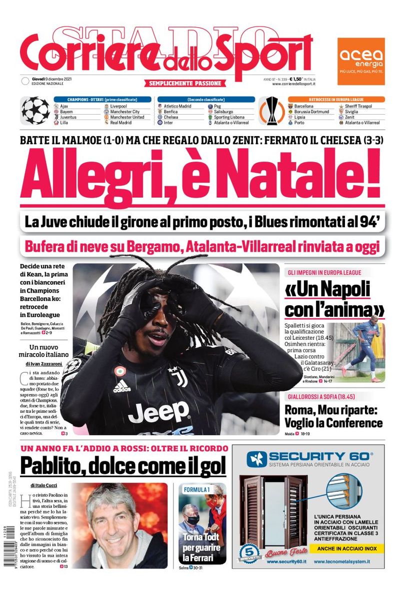 Il Corriere dello Sport apre in prima pagina con la gara decisiva del Napoli in Europa League con il Leicester: “Un Napoli con l’anima. Spalletti si gioca la qualificazione con il Leicester. Osimhen rientra: prima corsa". Spazio anche alla Lazio: "Lazio contro il Galatasaray: c'è Ciro". Al centro il primato della Juventus in Champions League: "Allegri, è natale! La Juve chiude il girone al primo posto, Blues rimontati al 94'". Si parla anche del rinvio del match dell'Atalanta causa neve: "Bufera di neve su Bergamo, Atalanta-Villarreal rinviata a oggi". Di spalla la Roma, impegnata in Conference League.