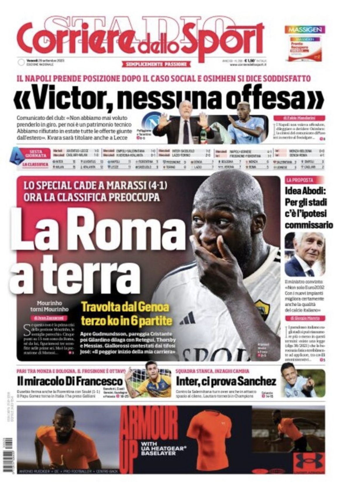 “Victor, nessuna offesa”. Titola così in taglio alto l’edizione odierna del Corriere dello Sport in riferimento al comunicato del Napoli sul caso Osimhen: "Il Napoli prende posizione dopo il caso social e Osimhen si dice soddisfatto". Al centro il pesante ko per 4-1 della Roma a Genova: "La Roma trema". In taglio basso il Frosinone e l'Inter.
