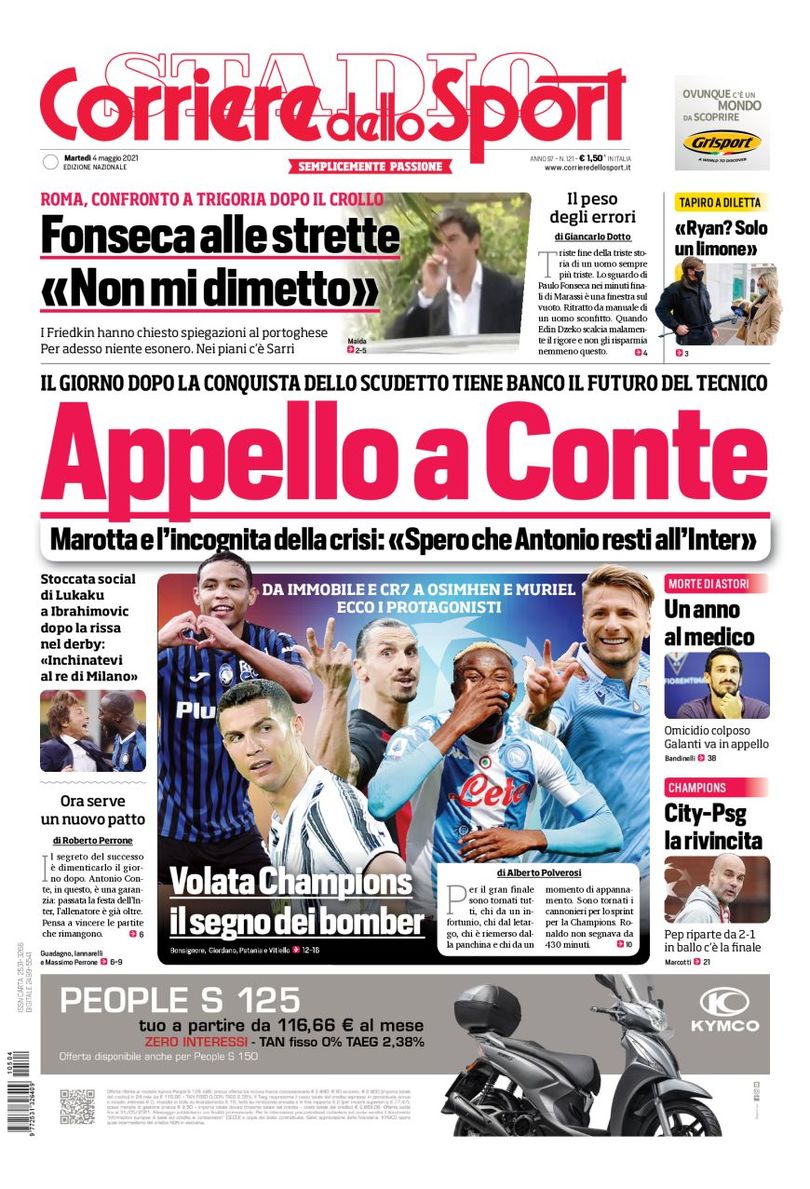 Il Corriere dello Sport apre in prima pagina con la corsa alla Champions in questo rush finale di campionato: "Volata Champions, il segno dei bomber. Da Immobile e CR7 a Osimhen e Muriel. Ecco i protagonisti”. In alto il futuro ancora in bilico di Conte: "Appello a Conte" e il confronto in casa Roma a Trigoria dopo crollo: "Fonseca alle strette: "Non mi dimetto"".