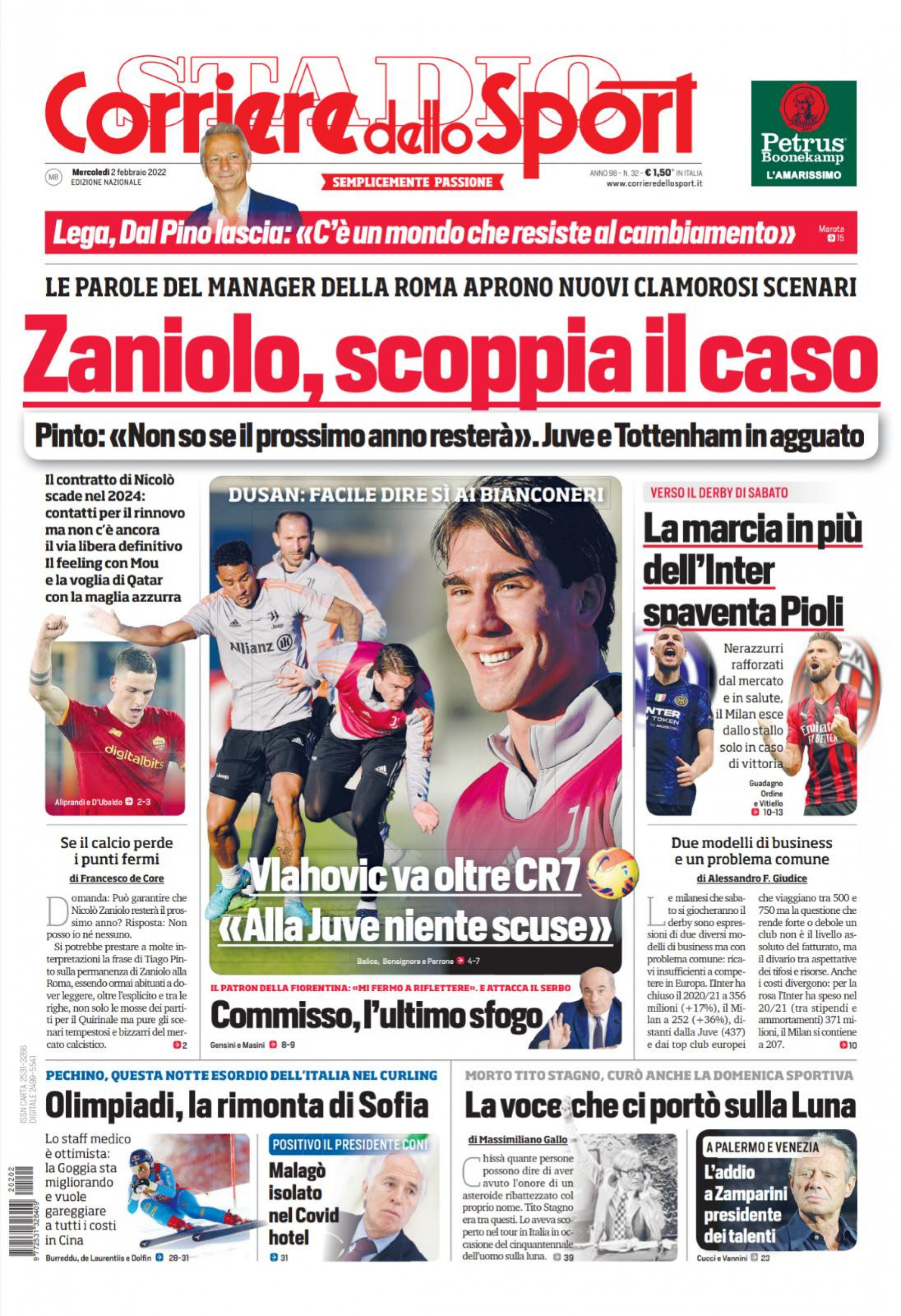"Zaniolo scoppia il caso". Nell'edizione di oggi, il Corriere dello Sport apre in prima pagina con le parole del manager della Roma Pinto che apre alla cessione del talento giallorosso: "'Non so se il prossimo anno resterà'. Juve e Tottenham in agguato". Di spalla spazio al prossimo derby della Madonnina: "La marcia in più dell'Inter spaventa Pioli". A centro pagina le prime dichiarazioni di Vlahovic con la nuova maglia bianconera: "Vlahovic va oltre CR7: 'Alla Juve niente scuse'".