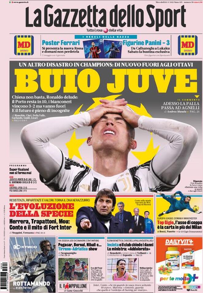 La Gazzetta dello Sport dedica la prima pagina di oggi al terza eliminazione consecutiva della Juventus in Champions League: "Buio Juve. Un altro disastro in Champions: di nuovo fuori agli ottavi". In basso spazio a Donnarumma, impegnato domani col Milan in Europa League: "Top Gigio, l'asso di coppa è la carta in più del Milan".