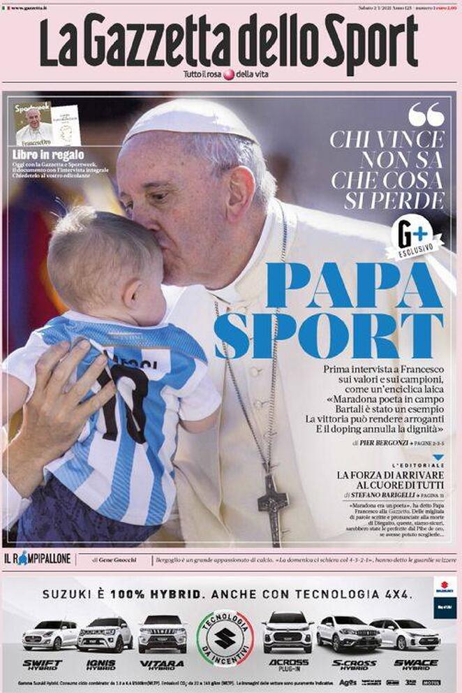 "Papa sport" scrive La Gazzetta dello Sport in apertura con un'intervista a Papa Francesco. "Chi vince non sa cosa si perde" dice il Pontefice. Prima intervista a Francesco sui valori e sui campioni, come un'enciclica laica: "Maradona poeta in campo, Bartali è stato un esempio. La vittoria può rendere arroganti e il doping annulla la dignità".