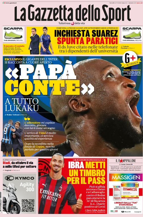 L'edizione odierna de La Gazzetta dello Sport apre in prima pagina con un'intervista esclusiva a Romelu Lukaku, nella quale il gigante belga si racconta e parla del suo rapporto con il tecnico nerazzurro: "Papà Conte", il titolo in prima pagina. "L'allenatore mi capisce davvero: giocare con lui è come un sogno", dichiara l'attaccante nerazzurro, che poi prosegue: "Dopo la sconfitta di Coppa non ho parlato per quattro giorni". Infine una parola sull'ultimo acquisto nerazzurro, Vidal: "Il suo arrivo è molto importante, ci serviva esperienza e qualità".