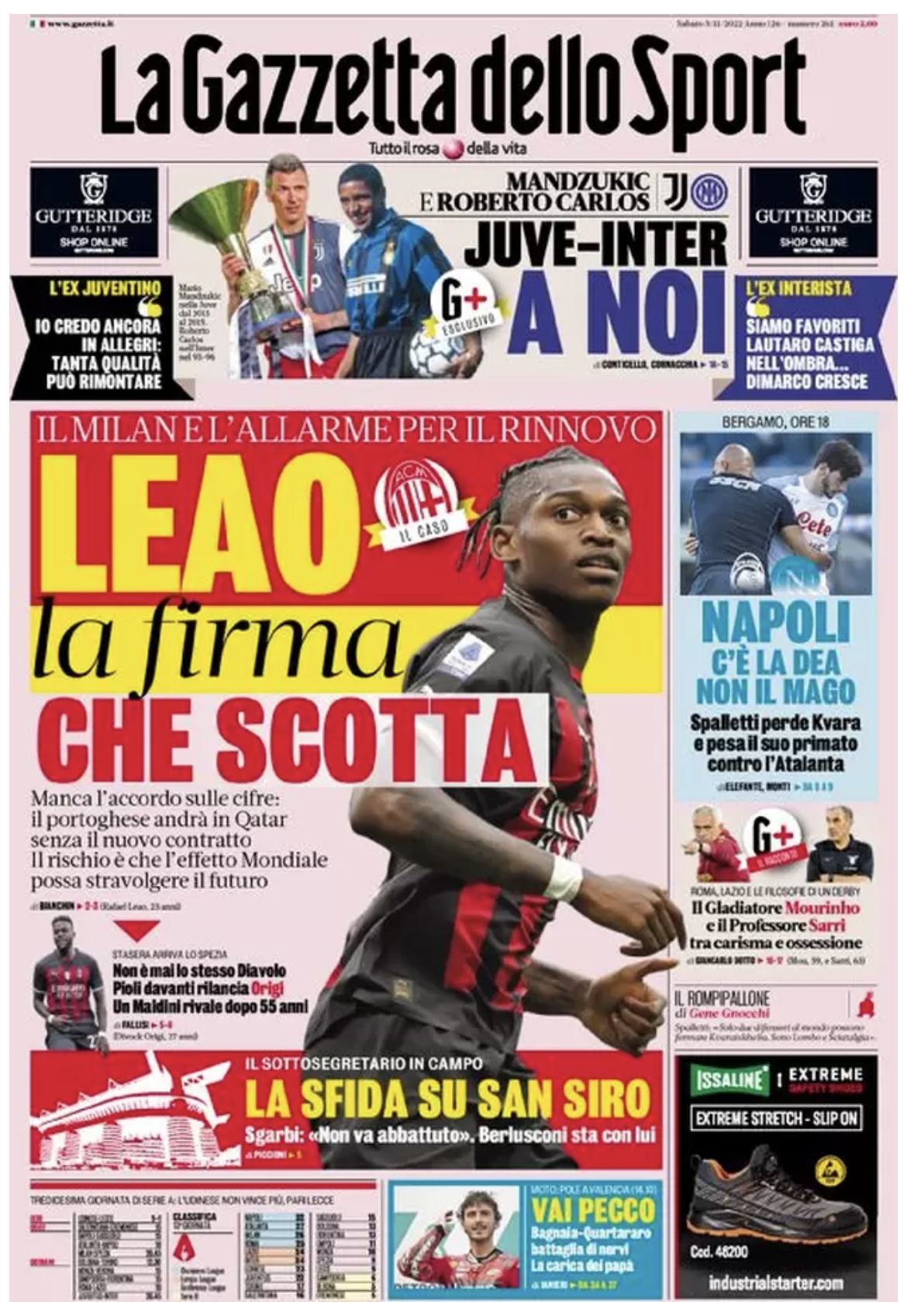 "Leao, la firma che scotta" è il titolo con cui si apre l'odierna edizione de La Gazzetta dello Sport in edicola oggi in merito al rinnovo di Leao. Manca l'accordo sulle cifre: il portoghese andrà in Qatar senza il nuovo contratto. Il rischio è che l'effetto Mondiale possa stravolgere il futuro. E' allarme per il rinnovo. Il Napoli di spalla: "C'è la Dea, non il Mago: Spalletti perde Kvara"