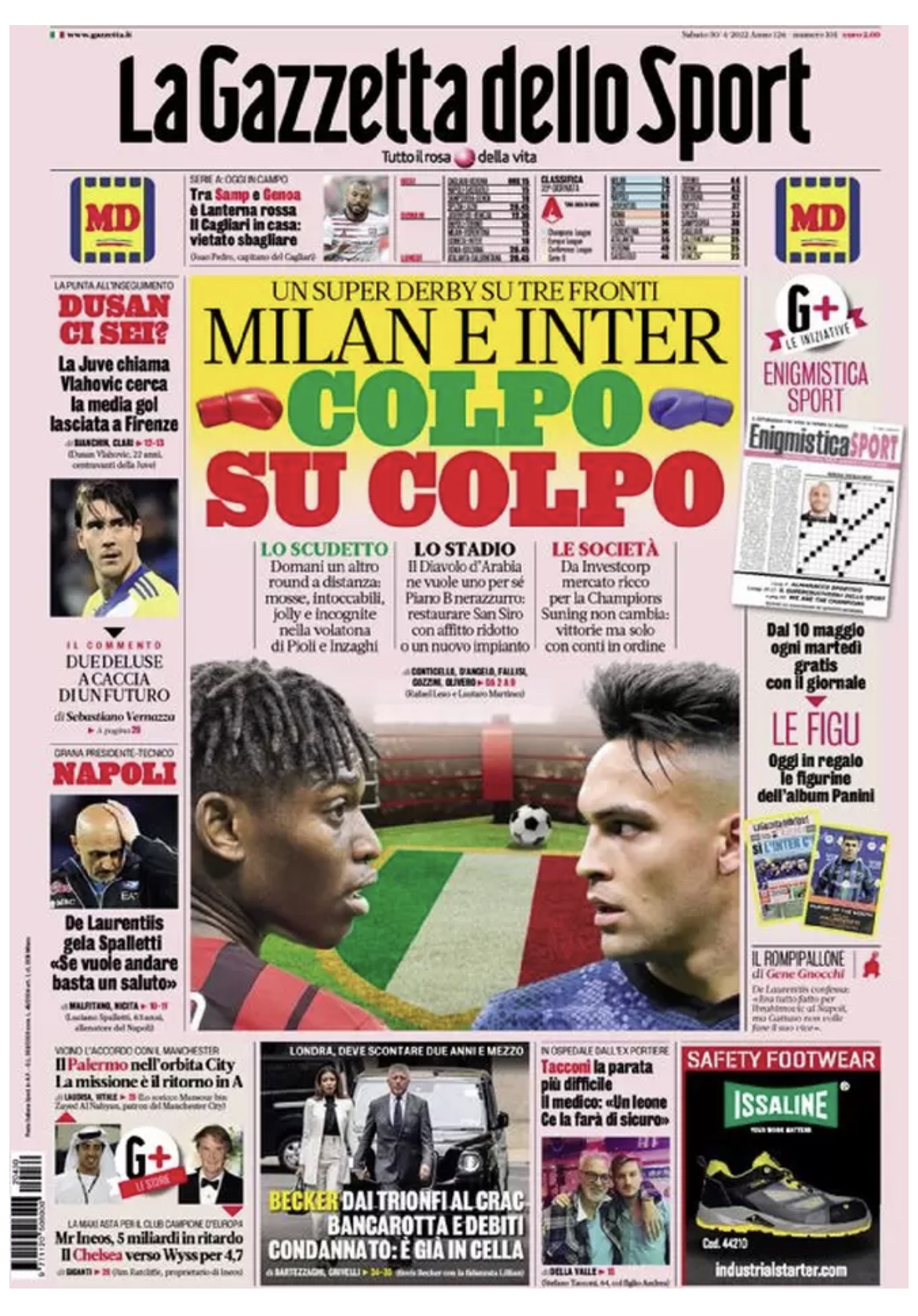 "Milan e Inter: colpo su colpo" è il titolo con cui si apre l'odierna edizione de La Gazzetta dello Sport in edicola sulla corsa scudetto tra le due milanesi. Un super derby su tre fronti: per quanto riguarda la vittoria del campionato, domani sarà un altro round a distanza. Mosse, intoccabili, jolly e incognite nella volatona di Pioli e Inzaghi. Sullo stadio: il Diavolo d'Arabia ne vuole uno per sé. Piano B nerazzurro: restaurare San Siro con affitto ridotto o un nuovo impianto. Sulle società: Da Investcorp mercato ricco per la Champions. Suning non cambia, vuole vittorie ma solo con conti in ordine.
