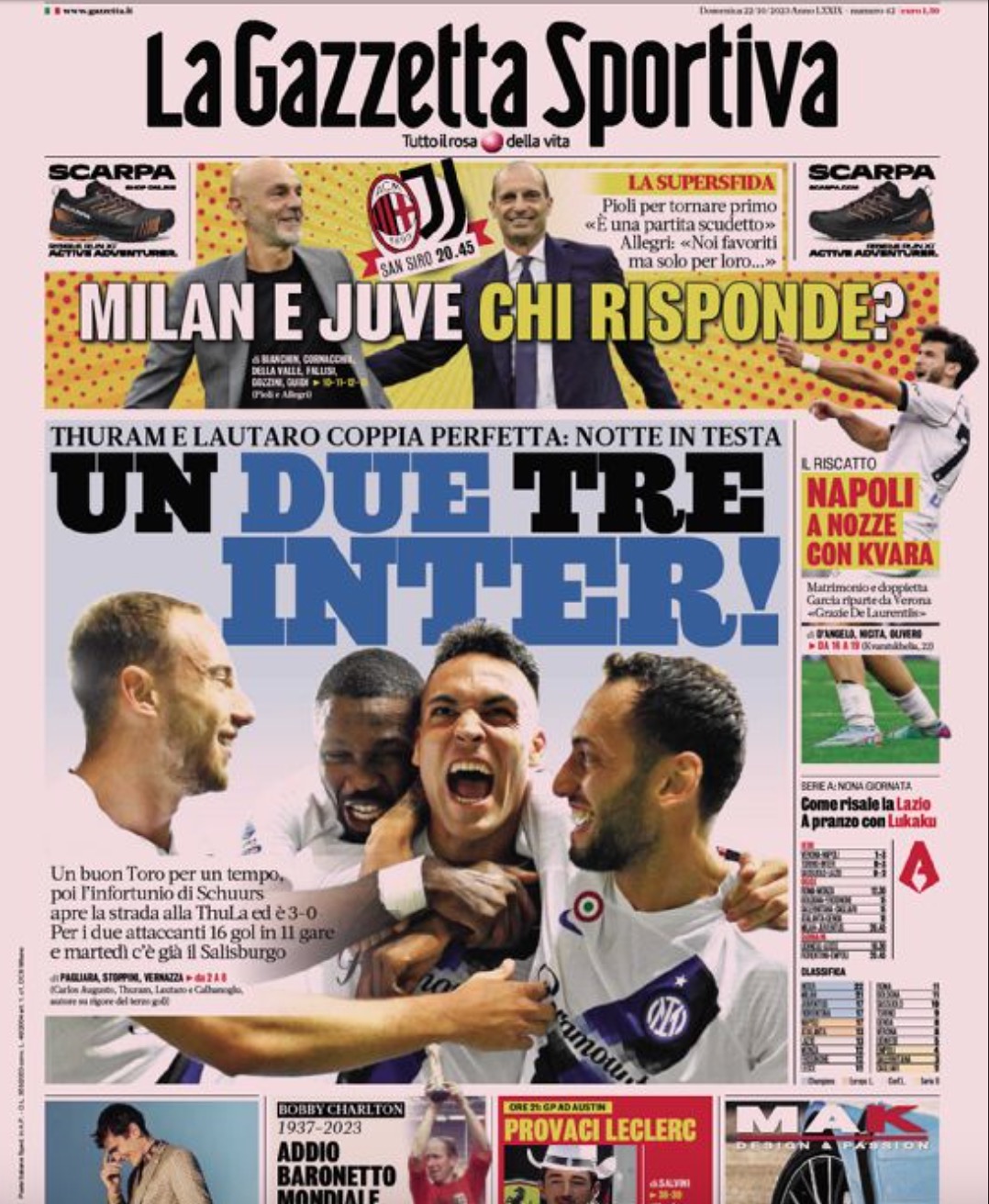 "Napoli a nozze con Kvara" titola di spalla la Gazzetta dello Sport giocando sul recente matrimonio del georgiano: "Matrimonio e doppietta, Garcia riparte da Verona". L'apertura è dell'Inter: "Un, due e tre, Inter. Notte in testa" ed in taglio alto il big-match: "Milan e Juve, chi risponde?"