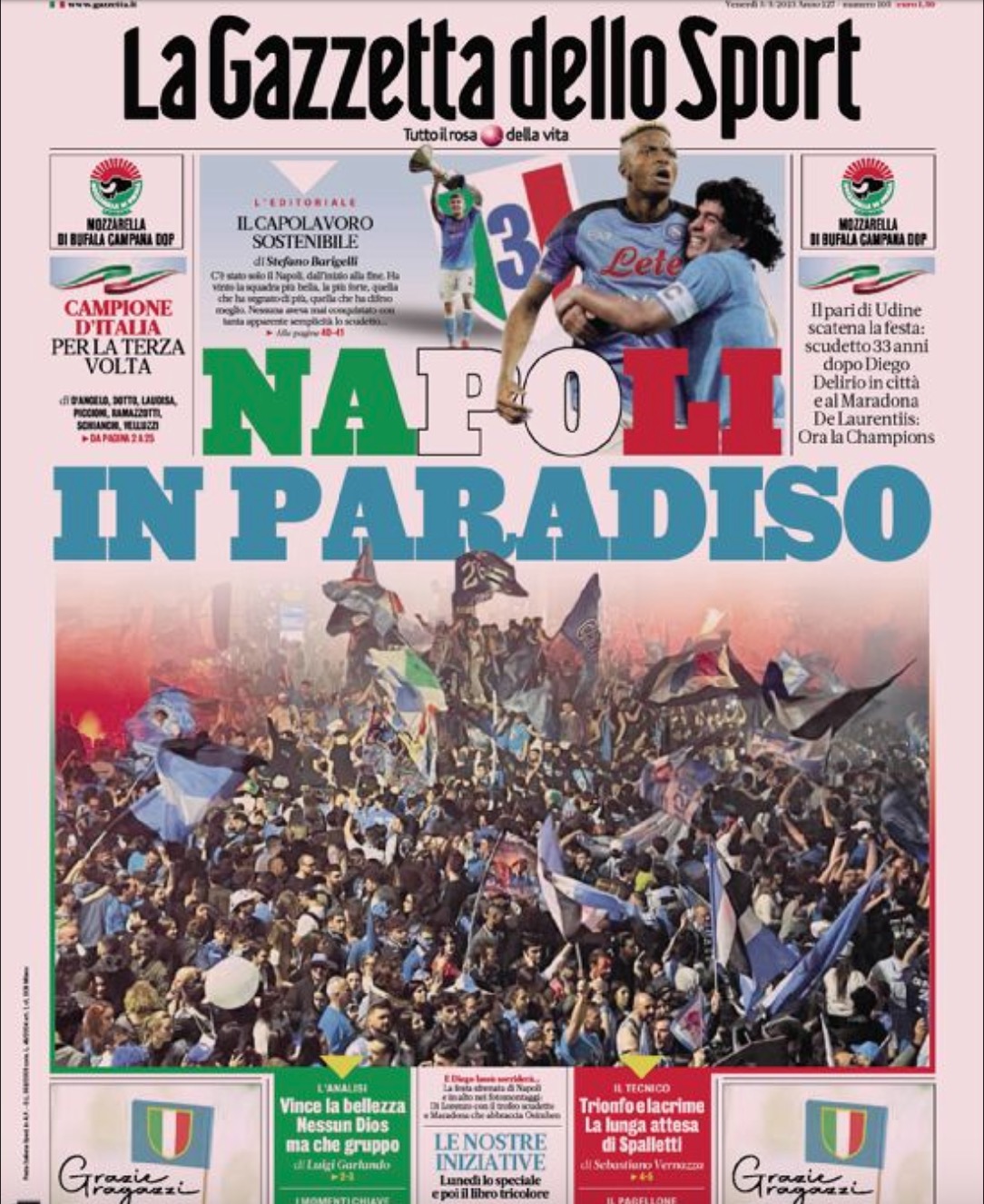 "Napoli in paradiso". Così titola oggi La Gazzetta dello Sport e non potrebbe essere altrimenti perché, 33 anni dopo Maradona, il Napoli torna a festeggiare lo scudetto. Per la matematica è decisivo l'1-1 contro l'Udinese in terra friulana. De Laurentiis: "Ora la Champions".