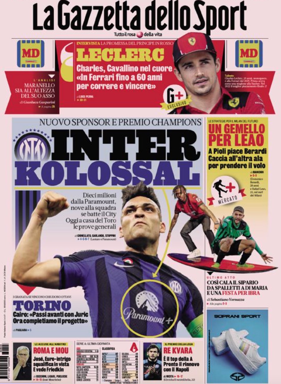 "Inter kolossal". Così titola in prima pagina La Gazzetta dello Sport, riferendosi al fato che i nerazzurri in finale di Champions avranno Paramount come sponsor sulla maglia. 10 milioni da questo marchio, 9 alla squadra se batte il City. Oggi c'è la prova generale contro il Torino.
