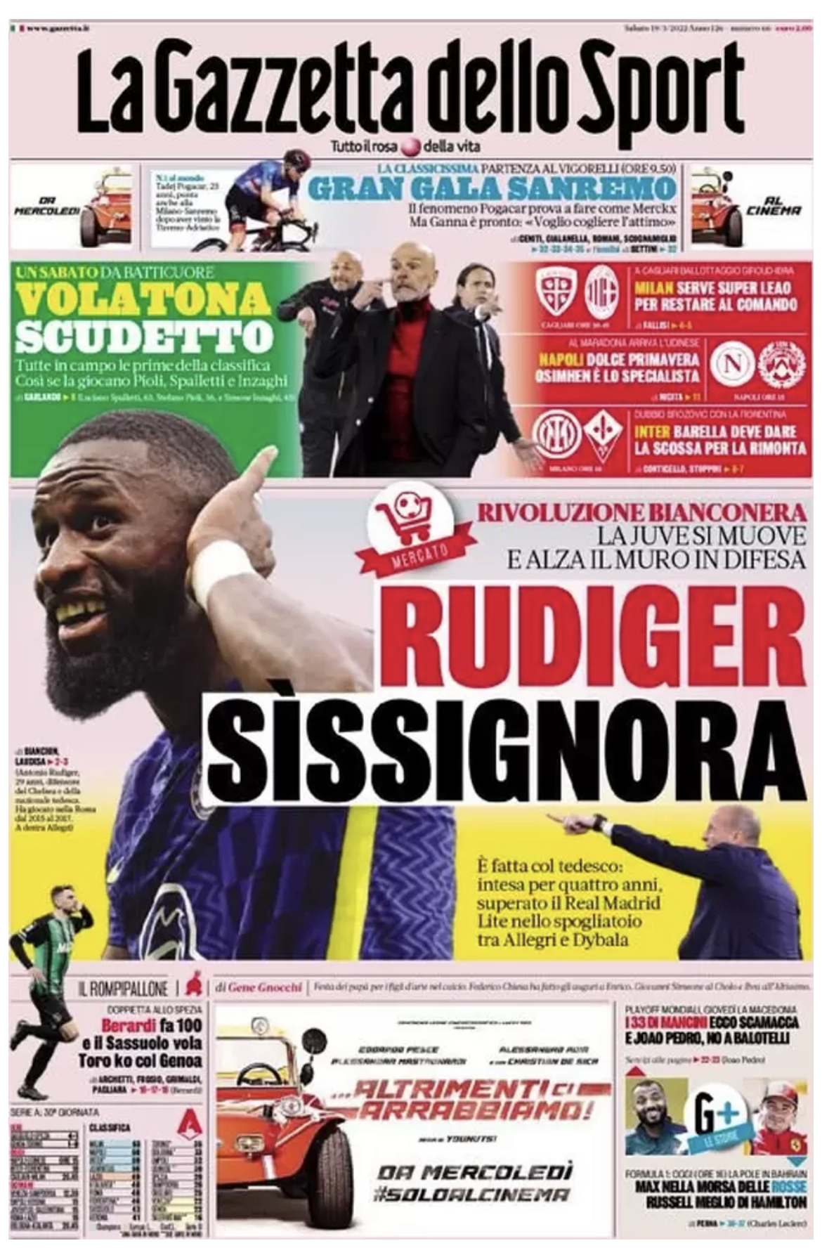 PRIMA PAGINA - Gazzetta dello Sport: "Rudiger sìssignora. Volatona Scudetto"
