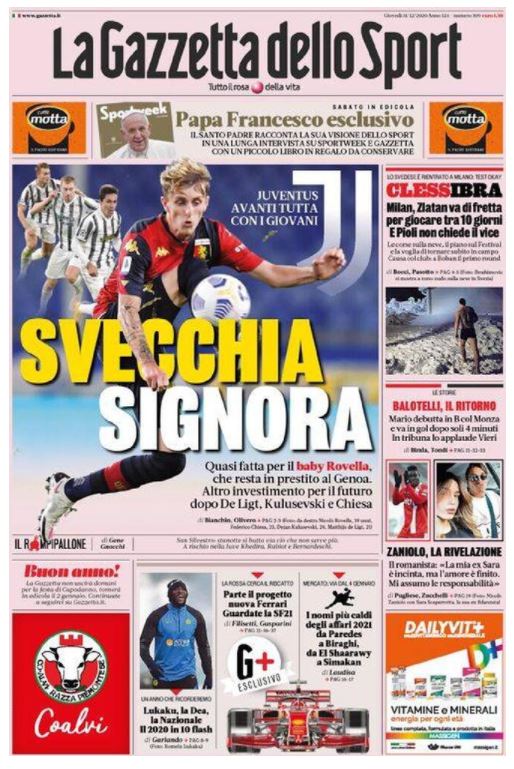 "SVecchia Signora". Questo il titolo di apertura in prima pagina de La Gazzetta dello Sport sulla Juventus nell'edizione odierna. I bianconeri puntano forte sui giovani. Quasi fatta per il baby Rovella che però resta in prestito al Genoa. Altro investimento per il futuro dopo quelli fatti con De Ligt, Kulusevski e Chiesa.