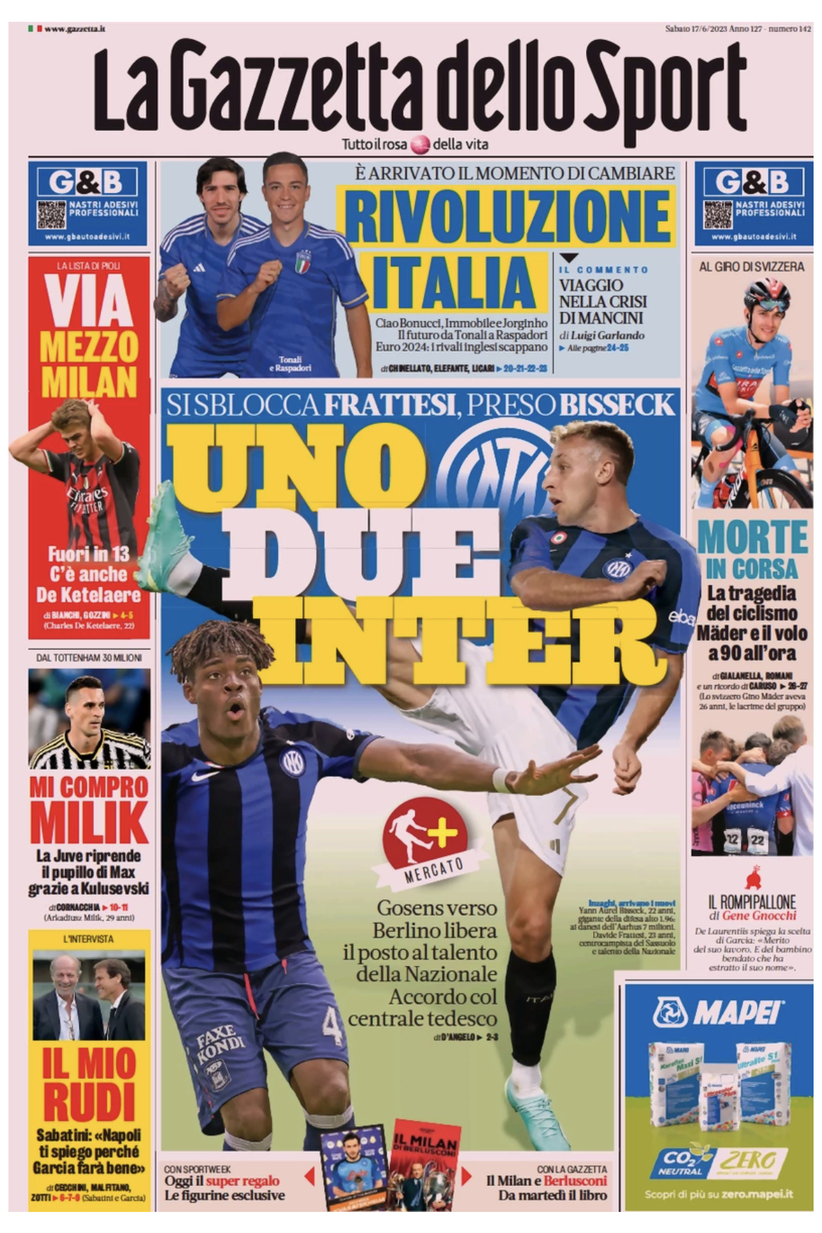 "Uno, due Inter" è il titolo con cui si apre l'edizione odierna de La Gazzetta dello Sport in edicola stamani in merito al mercato nerazzurri. Si sblocca Frattesi, preso Bisseck: Gosens verso Berlino libera il posto al talento della Nazionale. C'è l'accordo invece col centrale tedesco. In un box in basso Sabatini che approva la scelta Garcia fatta dal Napoli.
