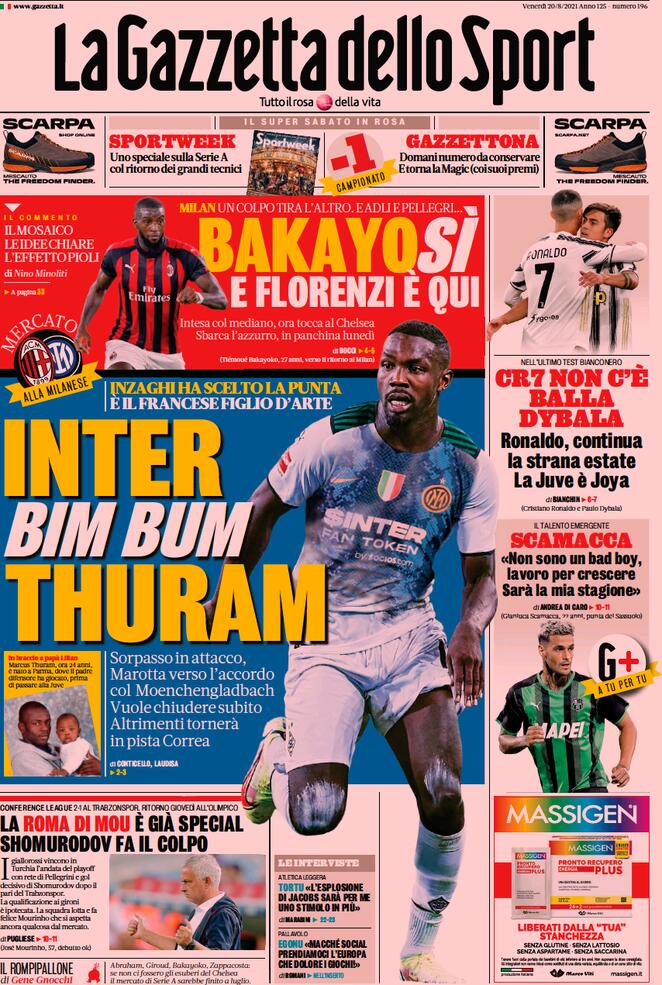 "Inter, bim bum Thuram" titola in prima pagina questa mattina La Gazzetta dello Sport. Inzaghi ha scelto la punta, è il francese figlio d'arte: sorpasso in attacco, Marotta verso l'accordo col Moenchengladbach. Vuole chiudere subito, altrimenti tornerà in pista Correa.