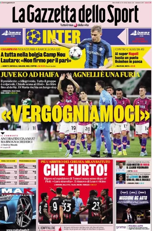 "Vergogniamoci". Queste le parole di Andrea Agnelli, presidente della Juventus, che La Gazzetta dello Sport ha riportato in apertura in prima pagina nell'edizione odierna. Bianconeri ko ad Haifa, il numero uno del club è una furia: "Allegri resta. Tutto il gruppo è colpevole. Chiedo scusa ai tifosi". In ritiro fino al derby. Di Maria rischia un lungo stop.