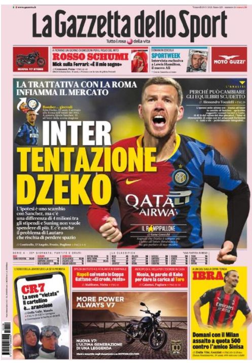 "Inter tentazione Dzeko". Questo il titolo di apertura in prima pagina de La Gazzetta dello Sport nell'edizione odierna sui nerazzurri. La trattativa con la Roma infiamma il mercato: l'ipotesi è uno scambio con Sanchez, ma c'è una differenza di 4 milioni di euro tra gli stipendi e Suning non vuole spendere di più. E c'è anche il problema di Lautaro Martinez che rischia di perdere spazio.
