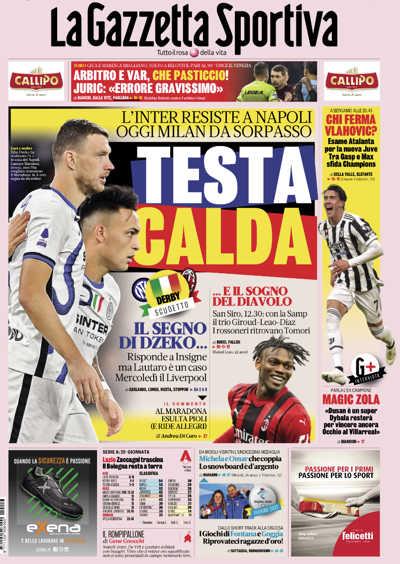 "Testa calda". Questo il titolo in prima pagina dell'edizione odierna della Gazzetta dello Sport. Il riferimento è alla situazione in vetta alla classifica con Napoli e Inter che hanno chiuso sull'1-1. Un gol di Dzeko ha rimesso in equilibrio il match del "Maradona" dopo il vantaggio partenopeo su rigore con Insigne con il Milan adesso che, in caso di successo contro la Samp, può guadagnare la testa.