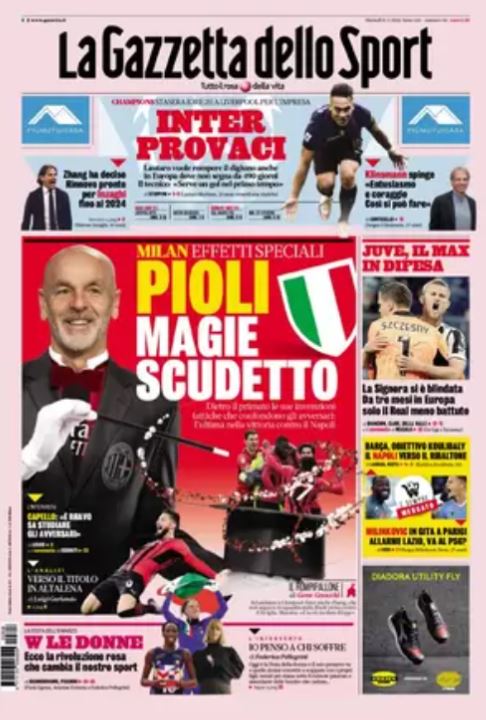 “Pioli, magie scudetto” titola stamani il quotidiano. Milan, effetti speciali - si legge - Dietro il primato le sue invenzioni tattiche che confondono gli avversari: l’ultima nella vittoria contro il Napoli.