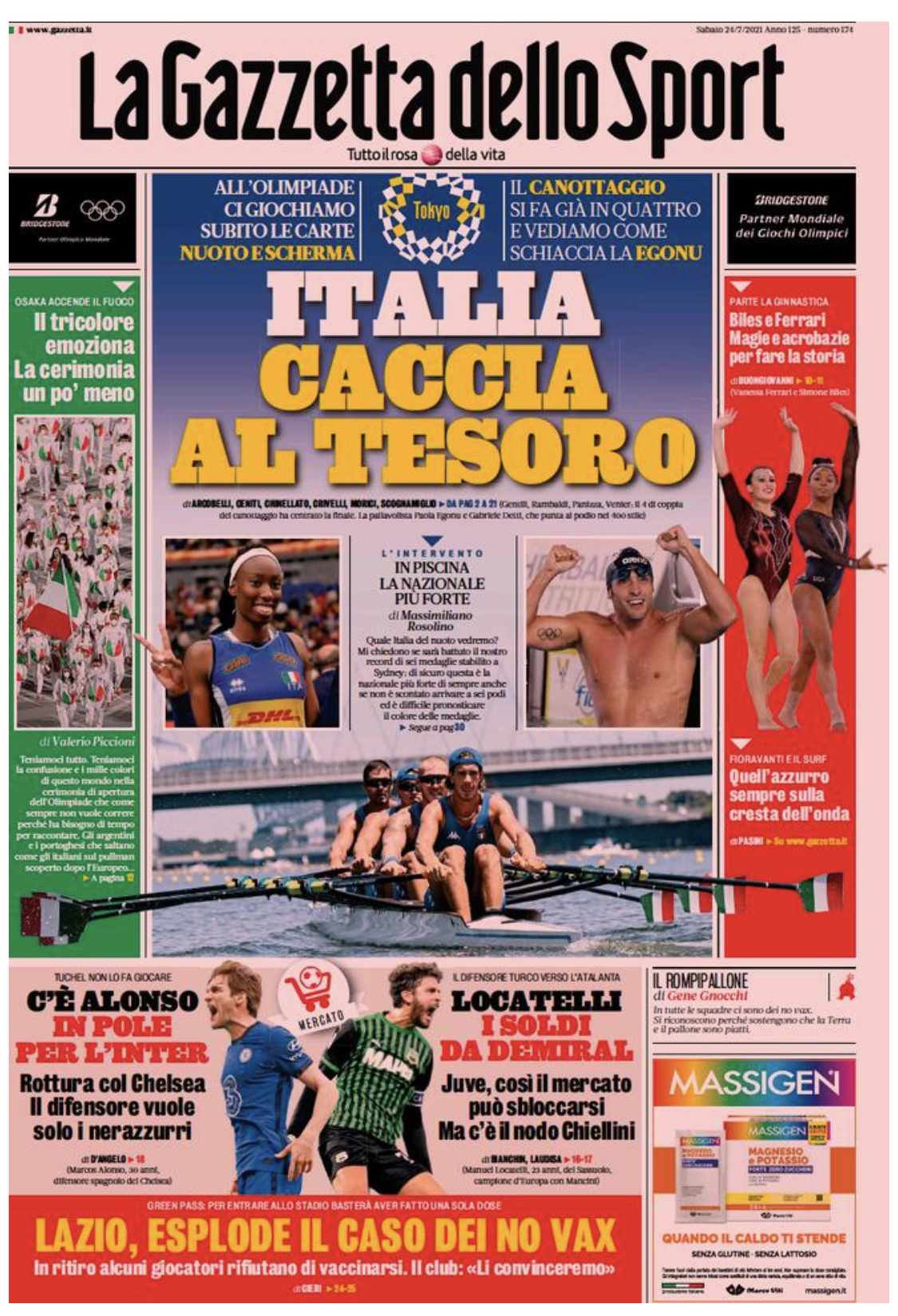 "Italia caccia al tesoro" è il titolo con cui si apre l'odierna edizione de La Gazzetta dello Sport sui Giochi Olimpici di Tokyo. All'Olimpiade gli atleti azzurri si giocano subito le carte di nuoto e scherma. Il canottaggio si fa già in quattro e vediamo come schiaccia la Egonu.