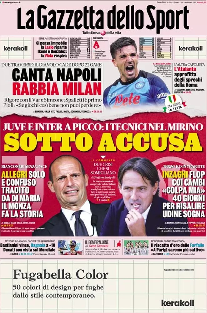 "Canta Napoli. Rabbia Milan", titola così in prima pagina la Gazzetta dello Sport nell'edizione odierna. "Rigore con il Var e Simeone: Spalletti è primo. Pioli: 'Se giochi così bene non puoi perdere'". In apertura la crisi di Juve e Inter: "Sotto accusa. Juve e Inter a picco: i tecnici nel mirino". Di spalla spazio alla vittoria all'Olimpico dell'Atalanta: "L'Atalanta approfitta degli sprechi della Roma".