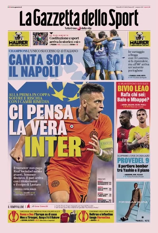 Nell'edizione di oggi, la Gazzetta dello Sport apre in prima pagina con il pareggio striminzito in rimonta dell'Inter con la Real Sociedad: "Ci pensa la vera Inter". In taglio alto spazio al Napoli, che batte il Braga al debutto in Champions: "Canta solo il Napoli. L'unico successo (1-2) italiano". Di spalla spazio alla stella del Milan: "Bivio Leao, Rafa chi sei: Balo o Mbappé?".