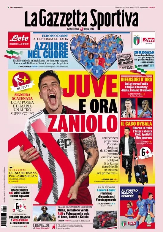 Si parla anche di giocatori svincolati, nel caso specifico di Paulo Dybala: "Ritorna in Italia - prosegue la rosea -, l'Inter rallenta. Pioli, Spalletti e Mou sperano". Infine il titolo sui "Difensori d'oro", facendo riferimento a de Ligt e Koulibaly: "De Ligt verso l'addio. Il Napoli a Koulibaly: Resta, ti diamo 30 milioni".